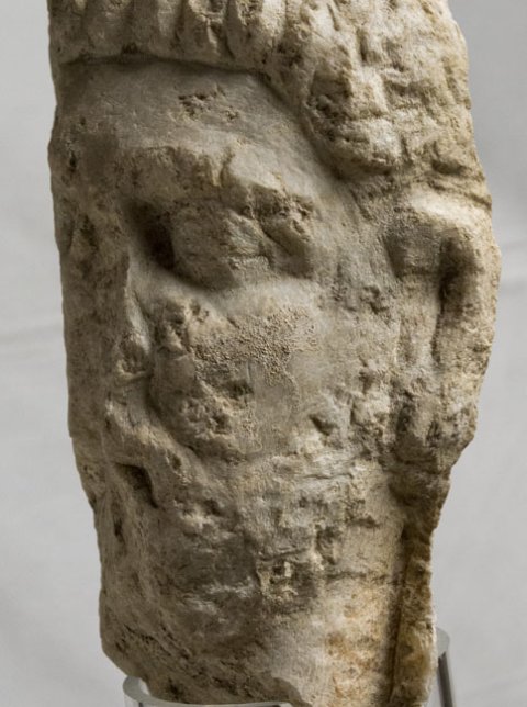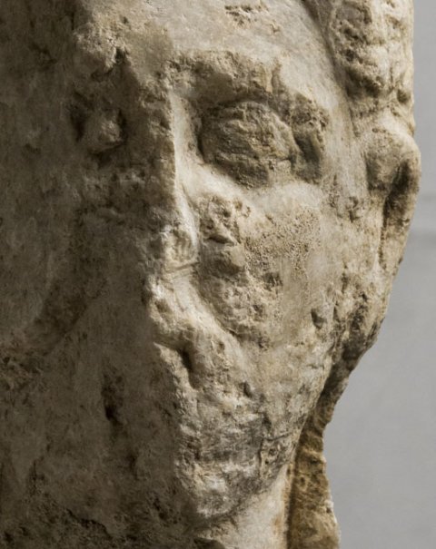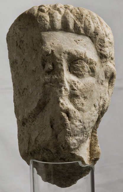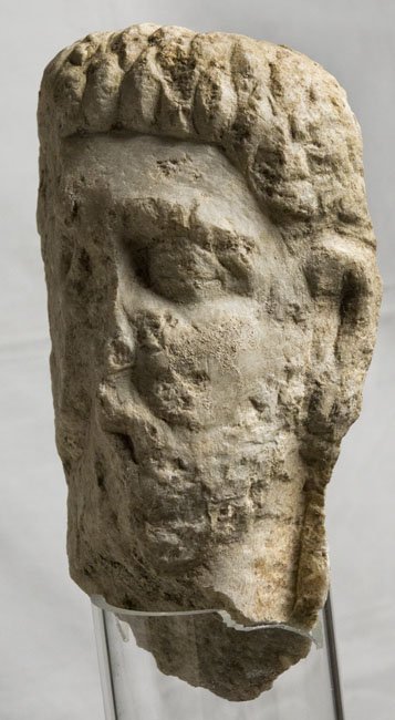 - rundum abgebr., nur linke Gesichtshälfte erhalten, stark bestoßen