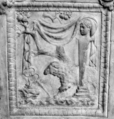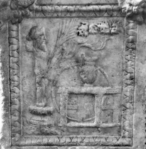 - Dreiseitiger Altarschaft, getragen von Hähnen. Schrift- und Relieffelder mit Kyma gerahmt, an den oberen Ecken Widderköpfe, auf der Oberseite Schildkröte. Nebenseiten: a. bärtige Herme, davor Tisch mit Kanne. b. jugendliche Herme, Baum, Widder, Caduceus.