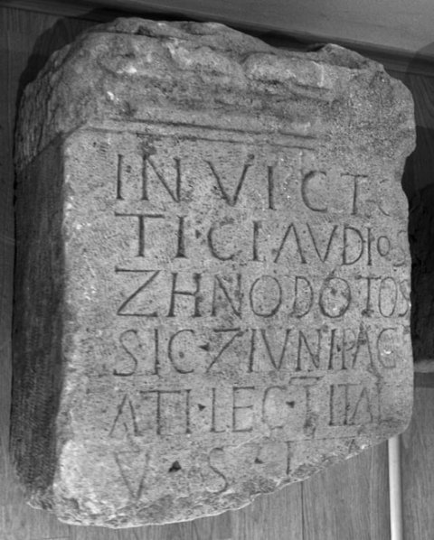- Invicto / Ti(berius) Claudios(!) / Zenodotos(!) / sig(nifer) |(centuriae) Iuni Pac/ati leg(ionis) I Ital(icae) / v(otum) s(olvit) l(ibens) m(erito)