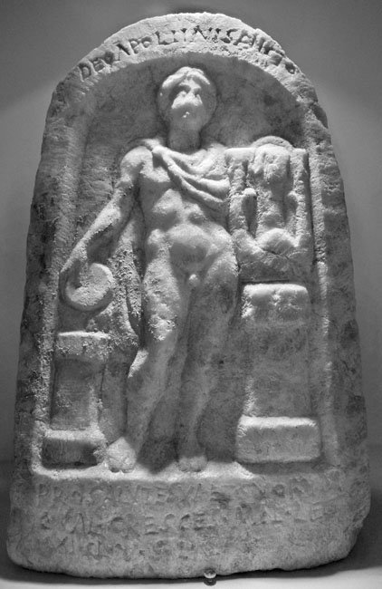 - Relief mit Bogenabschluss. Inschrift auf dem oberen Rahmen und unterhalb des Reliefs. Mythische Figur, Musikinstrument: stehender Apollo, nackt bis auf Mantel über linker Schulter und Arm, die Rechte hält eine Schale (patera) über einem Altar, der linke Arm liegt auf der auf einem Pfeiler stehenden Kithara.