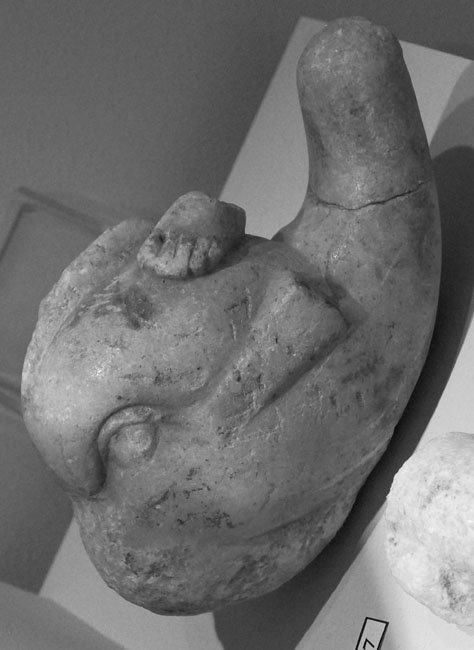 - Kopf des Delphins mit linkem Fuß eine Eroten