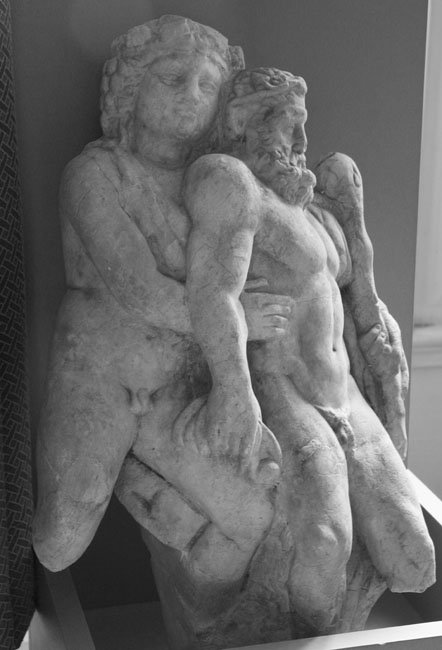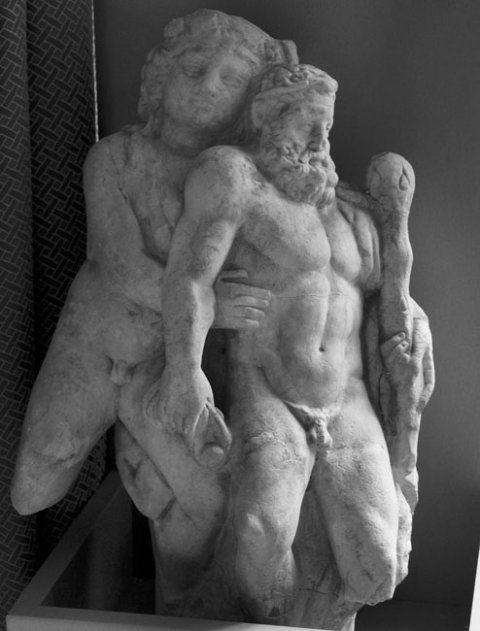 - Mythische Figuren: nackter jugendlicher Dionasos-Bacchus (Liber Pater) hält den zurücksinkenden bärtigen Hercules mit Keule und Löwenhaut, in der Rechten leerer Weinschlauch.