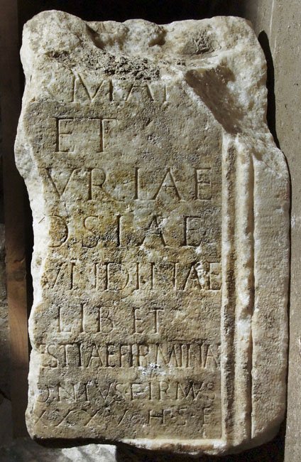 - [--- Ge?]rman[i] / [v(ivus)? f(ecit)? sibi?] et / [---]uriae / [---]osiae / [--- Sec]undinae / [---] lib(ert-) et / [---]estiae Firmina / [---]onius Firmus / [---] XXXV h(ic) s(it-) e(st)