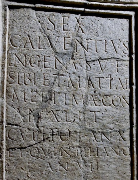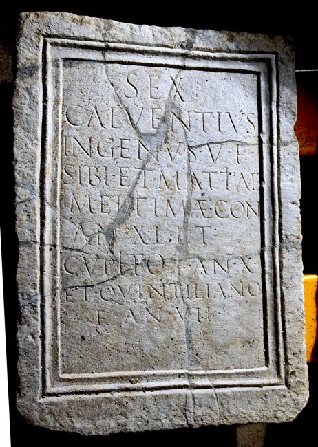 - Sex(tus) / Calventius / Ingenu(u)s v(ivus) f(ecit) / sibi et Mattiae / Meltimae con(iugi) / an(norum) XL et / Cupito f(ilio) an(norum) X / et Quintiliano / f(ilio) an(norum) VII