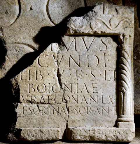 - [Pr]imus / [S]ecundi / lib(ertus) v(ivus) f(ecit) s(ibi) et / Boioniae / [S]urae con(iugi) an(norum) LX / Ce(n)sorinae sor(ori) an(norum) L