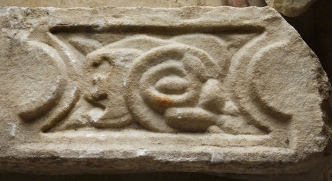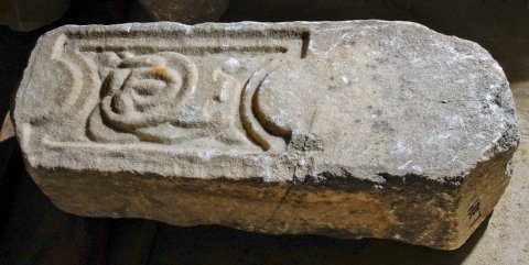 - Auf der Unterseite Soffitte : gerahmtes Feld mit einwärts gebogenen Schmalseiten. Im Feld Waffen (Peltenschild).
