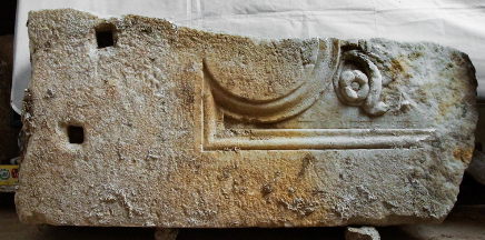 - Profilierter Rahmen mit bogenförmiger Einziehung, Rest einer Blütenranke ? Randleisten grob geglättet.