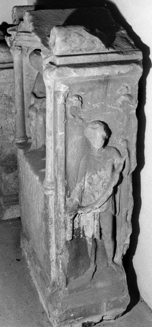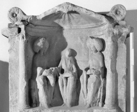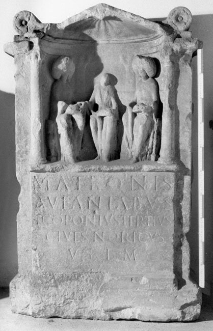 - Mythische Figuren: drei thronender Matronen mit Fruchtschalen auf den Knien. Bank in halbrunder Nische mit seitlichen Säulen, darüber Muschelbaldachin in offenem Giebel mit pulvini. Auf den Nebenseiten links Frau, rechts Jüngling mit Girlande in den Händen.