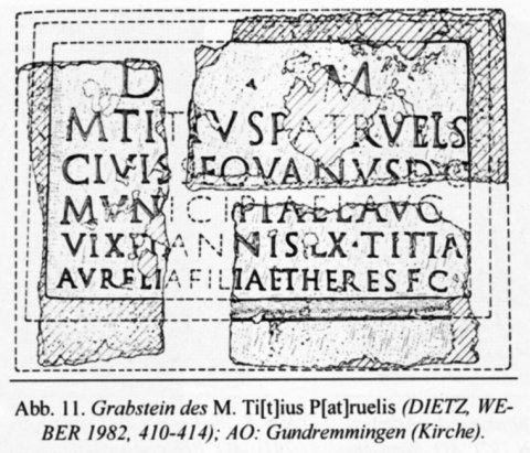 - D(is) M(anibus) / M(arcus) Ti[t]ius P[at]ruelis / civis [S]equanus d[e]c(urio) / mun[ici]pi Ael(i) Aug(usti) / vixit [an]nis LX Titia / Aureli[a fil]ia et heres f(acientdum) c(uravit)