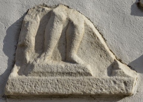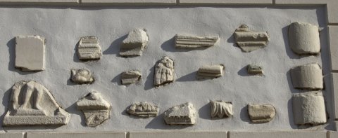 - Relieffragment mit Beinen einer stehenden Figur, Kopffragment mit Hörnern, profilierte Leisten von Gesimsen oder Altären, Rest eines Kymations, Blattornament, glatte Säulenschäfte.