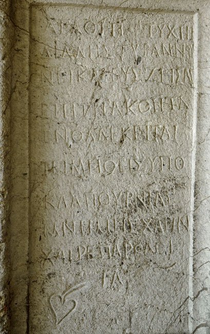ἀγαθῆι τύχηι./ Διλλης Τυράννου / Νεικαιεὺς ζήσας / ἔτη τριάκοντα / ἐνθάδε κεῖται / τειμηθεὶς ὑπὸ / Καλπουρνίας / μνήμης χάριν./ χαῖρε, παροδεῖ/τα.