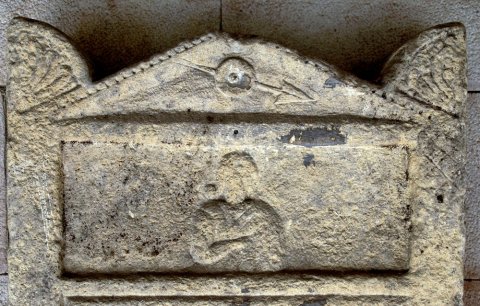 - Giebel mit Palmettenakroteren, im Giebelfeld runder Schild und Speer. Bildfeld mit Halbfigur einer Frau.