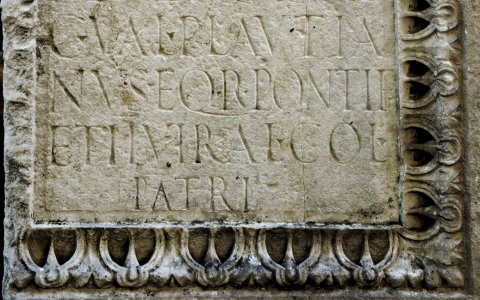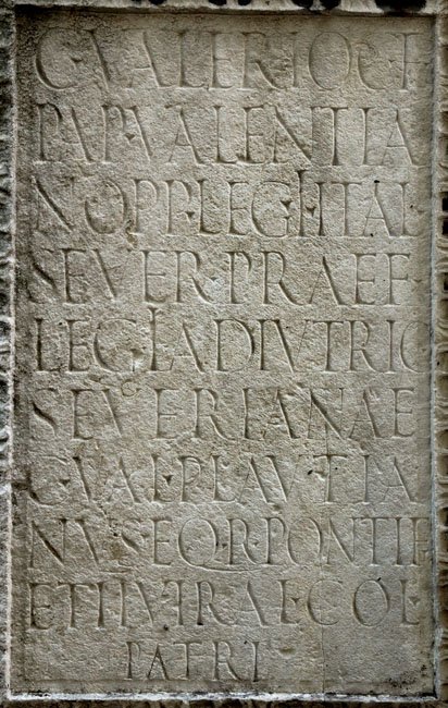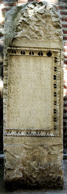 - C(aio) Valerio C(ai) f(ilio) / Pap(iria) Valentia/no p(rimo) p(ilo) leg(ionis) I Ital(icae) / Sever(ianae) praef(ecto) / leg(ionis) I adiutrici(s) / Severianae / C(aius) Val(erius) Plautia/nus eq(ues) R(omanus) pontif(ex) / et IIviral(is) col(oniae) / patri // l(ocus) d(atus) d(ecreto) d(ecurionum)