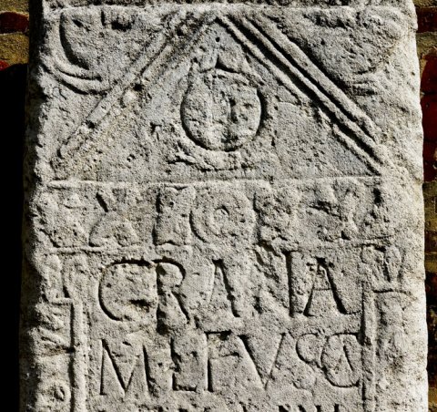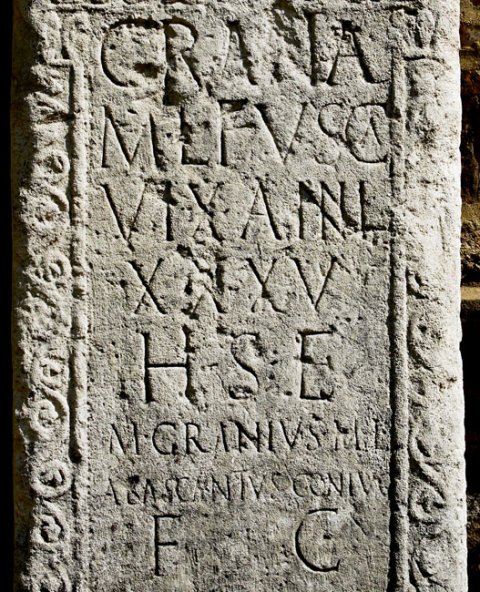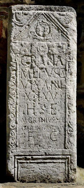 - Grania / M(arci) l(iberta) Fusca / vix(it) ann(os) / XXXV / h(ic) s(ita) e(st) / M(arcus) Granius M(arci) l(ibertus) / Abascantus coniugi / f(aciendum) c(uravit)