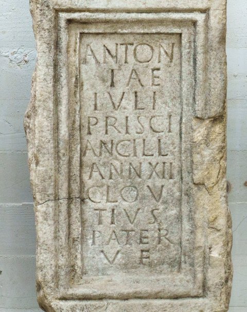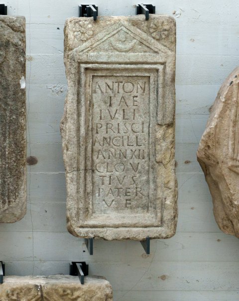 - Anton/iae Iuli(i) / Prisci ancill(ae) / ann(orum) XII / Clou/tius pater / v(ivus) f(ecit)