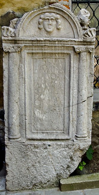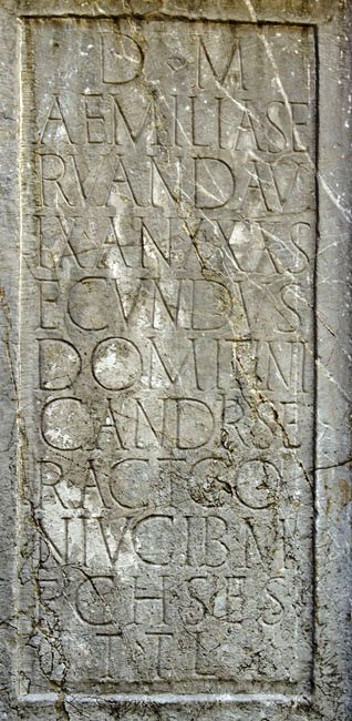 - D(is) M(anibus) / Aemilia Se/rvanda v/ix(it) an(nos) XXX S/ecundus / Domiti Ni/candr(i) se/r(vus) act(or) co/niugi b(ene) m(erenti) / f(aciendum) c(uravit) h(ic) s(ita) e(st) s(it) / t(ibi) t(erra) l(evis)
