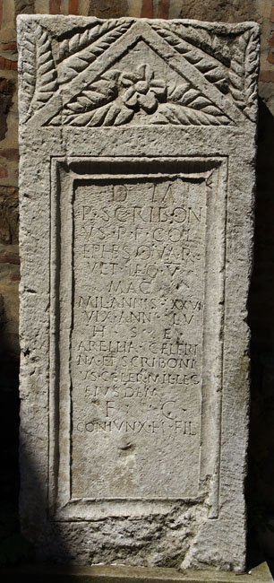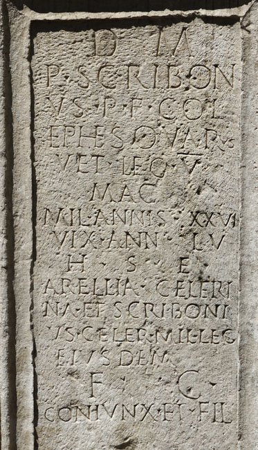 - D(is) M(anibus) / P(ublius) Scriboni/us P(ubli) f(ilius) Col(lina) / Epheso Varus / vet(eranus) leg(ionis) V / Mac(edonicae) / mil(itavit) annis XXVI / vix(it) ann(is) LV / h(ic) s(itus) e(st) / Arellia(!) Celeri/na et Scriboni/us Celer mil(es) leg(ionis) / eiusdem / f(aciendum) c(uraverunt) / coniunx et fil(ius)