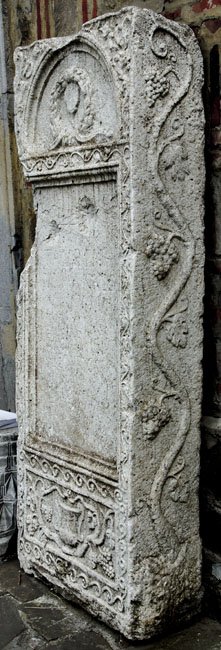 Akanthusranken und Palmetten. Auf dem Rahmen des Schriftfeldes Efeuranke. Sockelbild mit Krater zwischen Weinranken, auf dem Rahmen Volutenranke. Auf den Nebenseiten Weinranke. - Inschrift