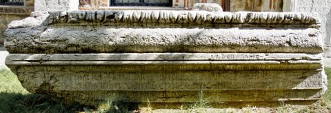 - Auf der Innenseite unten Fasciengliederung, darüber Falz (Auflager für Deckenblock ?). Schmalseite links der Inschrift profiliert. Über Inschriftzone polsterförmig vorgewölbt, darüber Eierstab.
