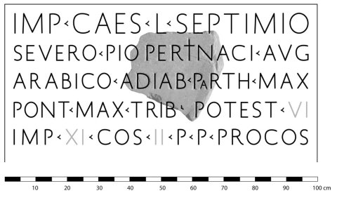 - [Imp(eratori) Caes(ari) L(ucio) Septimio] / [Sever]o Pertin[aci Aug(usto)] / [Arab(ico)] Adiab(enico) Par[th(ico) max(imo)] / [pont(ifici) max(imo) tri]b(unicia) p[ot(estate) ---] / [imp(eratori) --- co(n)s(uli) --- p(atri) p(atriae) proco(n)s(uli)]