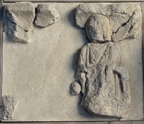 - aus z.T. nicht anpassenden Fragmenten zusammengesetzt, vom Relief nur ein Teil des rechten Togatus erhalten