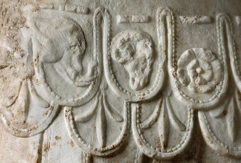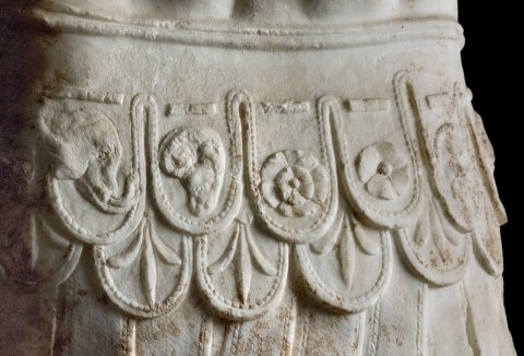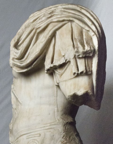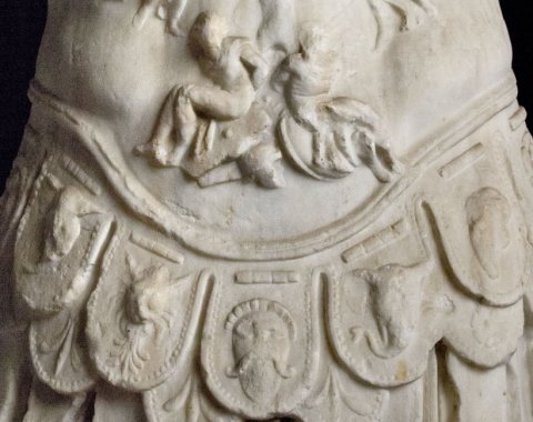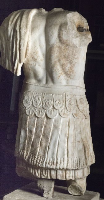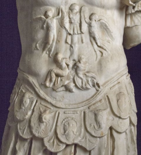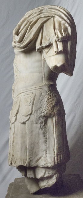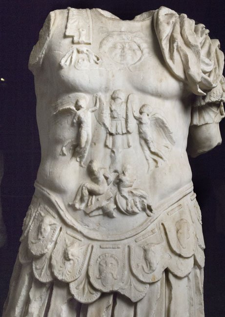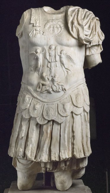 - Historische Person: Panzerstatue eines Kaiers. Auf dem Panzer Gorgoneion, darunter Tropaion (Tropaeum) zwischen Victorien, gefangene Barbaren auf Waffen. Auf den Pteryges Tierköpfe (Elefanten, Widder), Silensmaske, Rosetten.