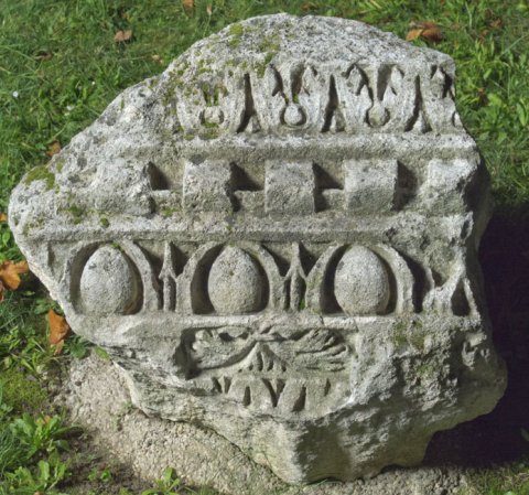 - Gesims, oben Blattfries, darunter Zahnschnitt, Eierstab, Konsolen, Kyma