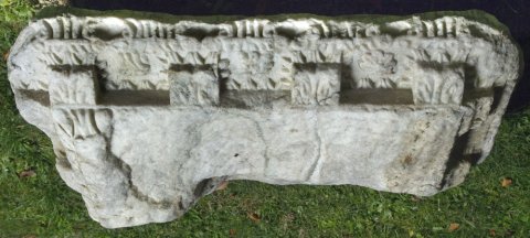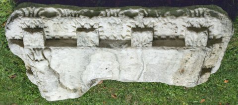 - an drei Seiten profilierter Gesimsblock mit Rosetten zwischen den Konsolen