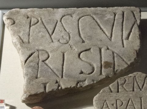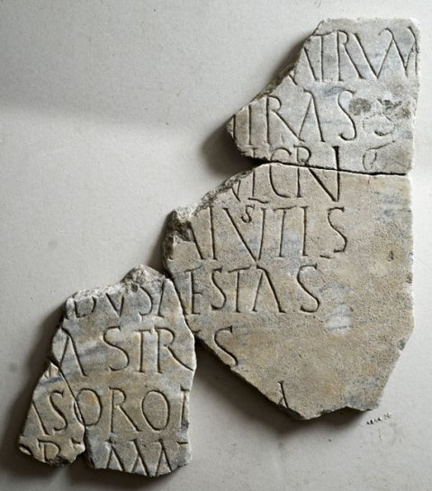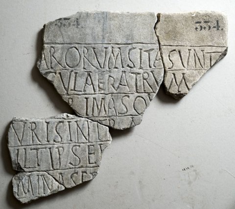 - [Hic tria? c]arorum sita sunt / [corpus]cula fratrum / [effundas? lac]rimas qu[i t]emplu(m) / [mart]uris(!) intra[s] / [haec? v]ult ipse I(?)[---]s tribu(s) / [---min]a sep[ulcri] / [------ [------ // [Hic tria carorum sita sunt co]rpuscula [f]ratrum / [effundas? lacrimas qui templum mart]uris(!) intras / [haec? vult ipse I(?)---s tribus ---]na se[p]ulcri / [---]a iustis / [---]bus aestas / [--- in] astris / [---a s]oror[e]m / [---] mat[er?] / [---