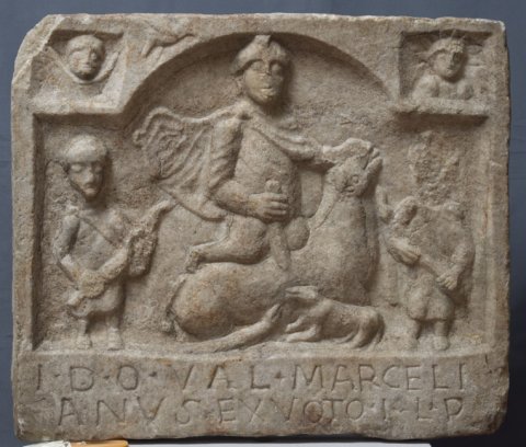 - I(nvicto) d(eo) O(mnipotenti) Val(erius) Marceli/anus ex voto l(ibens) l(aetus) p(osuit)