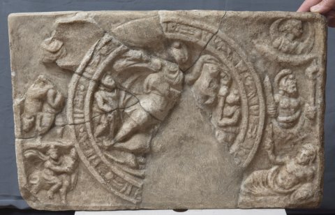 - Mythos (Mithras): Medaillon mit Stiertötung (Tauroktonie) zwischen Cautes und Cautopates. Auf dem Rahmen Tierkreiszeichen. In den oberen Ecken Büsten von Sol und Luna, darunter Mithrasszenen.