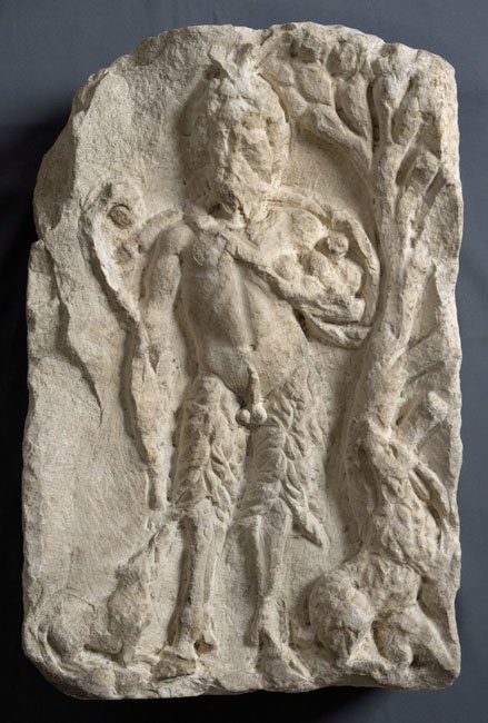 - Mythische Figur: Pan - Silvanus mit Bocksbeinen und Hörnern, im linken Arm Mantel mit Früchten, in der Rechten Zweig, neben dem rechten Fuß Hund, neben dem linken Ziege (?), am rechten Rand Baum.