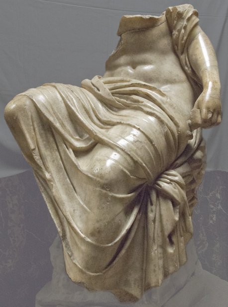 - Mythische Figur: auf Felsen sitzende Muse mit Mantel um Beine und linken Arm (Teil einer Apollo - Marsyas - Gruppe ?).