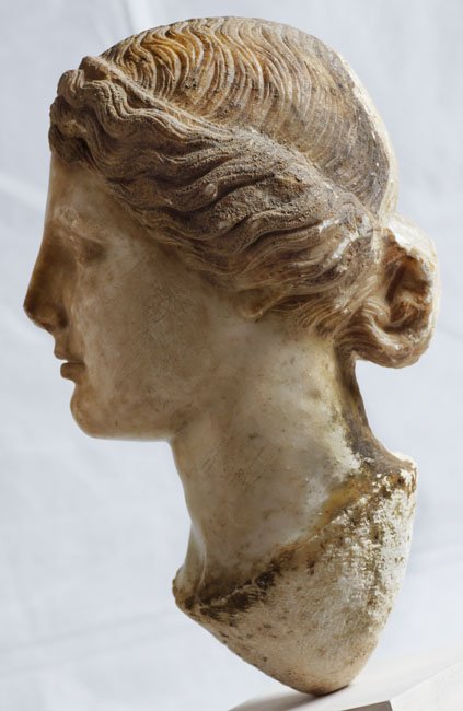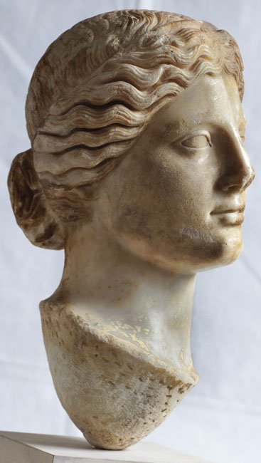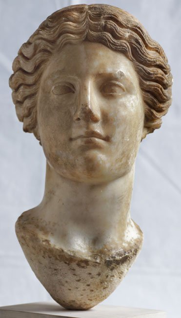 Mythische Figur: Venuskopf mit Binde im Haar und Nackenknoten.