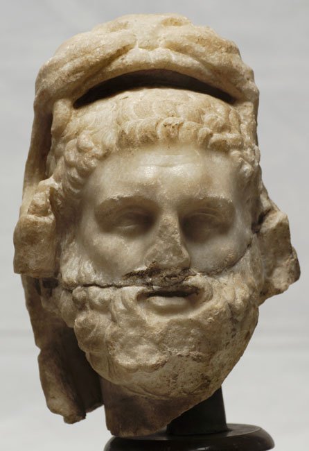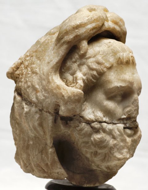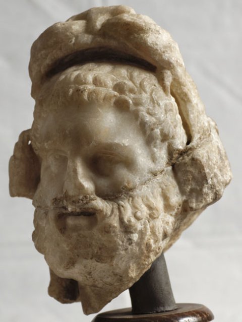 - Mythische Figur: bärtiger Hercules mit Löwenhaube.