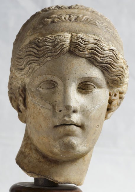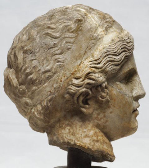 - Mythische Figur: Kopf einer Göttin (Venus ?) mit Binde im aufgesteckten Haar.
