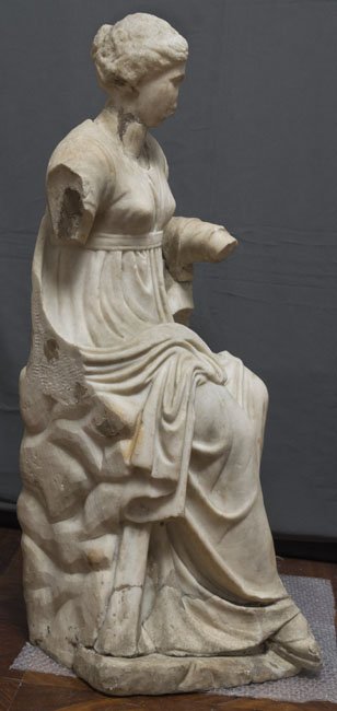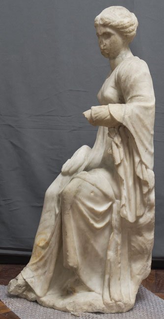 - rechter Arm u. linke Hand abgebr., bestoßen, Brüche durch den Hals