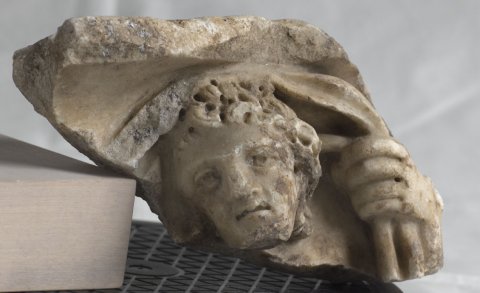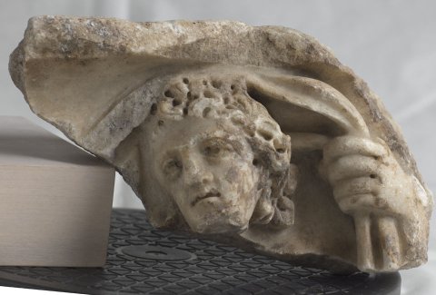 - Mythos (?): Fragment eines Reliefsarkophages mit Kopf und linker Hand einer Frau, die einen Schleier über dem Kopf hält (Raub der Proserpina ?).