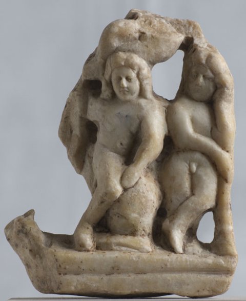 - Mythische Figur: erhalten sind zwei Eroten, einer auf einem Delphin reitend, der äußere stehend, auf Fackel (?) gestützt. Über den Köpfen der beiden Unterteil eines dritten Eroten. Auf der Basisleiste linker Fuß einer Venus(?)-Statuette.