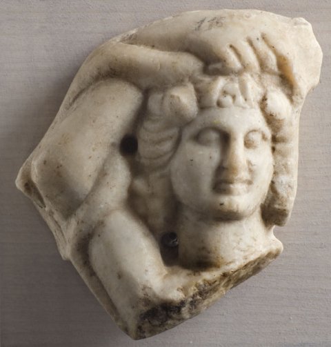 - Mythische Figur: Kopf einer Mänade mit erhobenem rechten Arm, um den sich eine Schlange windet.