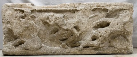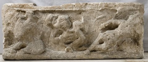 - Figürlicher Fries, rechts liegende Figur, links hockender Löwe (?). Auf der linken Schmalseite Rahmen mit Dreipassabschluss.