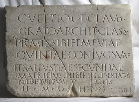 - C(aio) Vettio C(ai) f(ilio) Claud(ia) / Grato archit(ecto) class(is) pr(aetoriae) Mis(enensis) sibi et Meviae / Quintae coniug(i) suae / et Sallustiae Secundae / matri eius et libertis libertabus / posterisque eorum meis / h(oc) m(onumentum) s(ive) s(epulcrum) h(eredem) n(on) s(equetur)