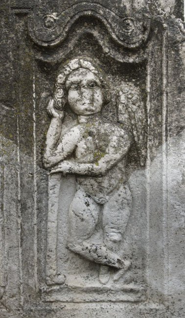 - Gerahmtes leeres Schriftfeld zwischen Feldern mit Trauergenien.