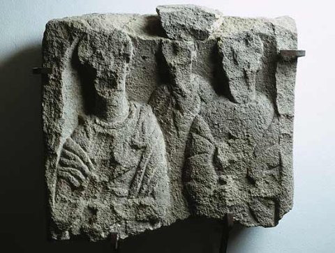 - Familie: Halbfiguren (?) eines Ehepaares mit Kind. Links einheimische Frau: Haube, Umhang, Fibeln, Torques. Rachts Mann. Kind zwischen den Eltern.