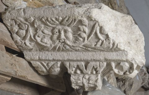 - Konsolgesims mit bärtiger Blättermaske zwischen Ranken