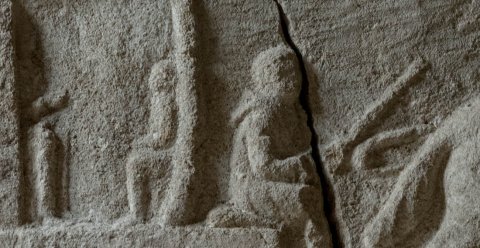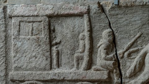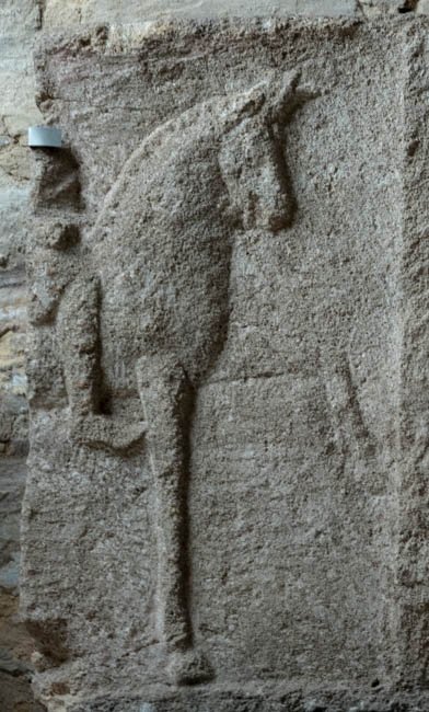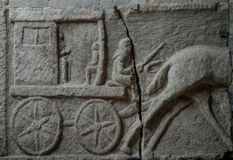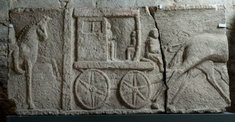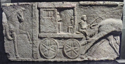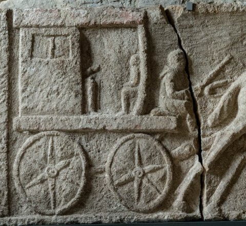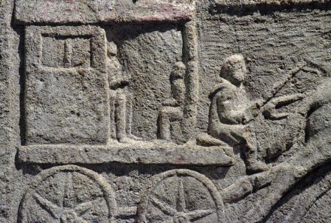 - Wagenszene: vierrädriger Wagen mit hausartigem Aufbau und Zweigespann, Kutscher mit Kapuzenmantel und Peitsche, als Fahrgast Frau, ihr gegenüber sitzt kleinere Figur (Dienerin ?).. Hinter dem Wagen Reiter.