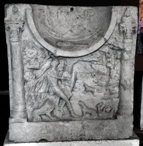 - Mythos, Musikinstrument: Sonnenuhr zwischen Säulen mit korinthischen Kapitellen, auf denen links eine weibliche Büste (Göttin), rechts eine Büste des Serapis steht. Unterhalb der Sonnenuhr Orpheus mit Lyra und Tieren.