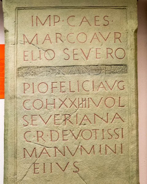 - [Imp(eratori)] Cae[s(ari)] / Marco Au[r]/elio [S]ever[o] / [[[Alexandro]]] / Pio Fe[l]i[ci] Aug(usto) / coh(ors) X[X]IIII vol(untariorum) / Severiana / c(ivium) R(omanorum) devotissi/ma numini / ei{i}us