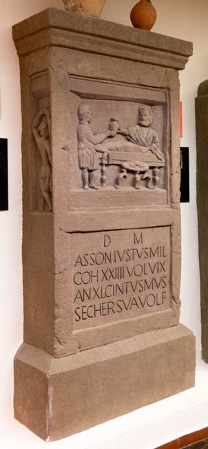 - D(is) M(anibus) / Asson(ius) Iustus mil(es) / coh(ortis) XXIIII vol(untariorum) vix(it) / an(nos) XL Cintusmus / sic(undus)! her(es) sua vol(untate) f(ecit)