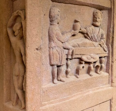 - Über der Inschrift Bildfeld mit Totenmahl (auf Kline bärtiger Mann im Mantel, dem ein Diener ein Gefäß reicht. Vor der Kline Tischchen mit Broten). Auf den Nebenseite je eine nackte tanzende Mänade (rechts in Vorder-, links in Rückenansicht).
